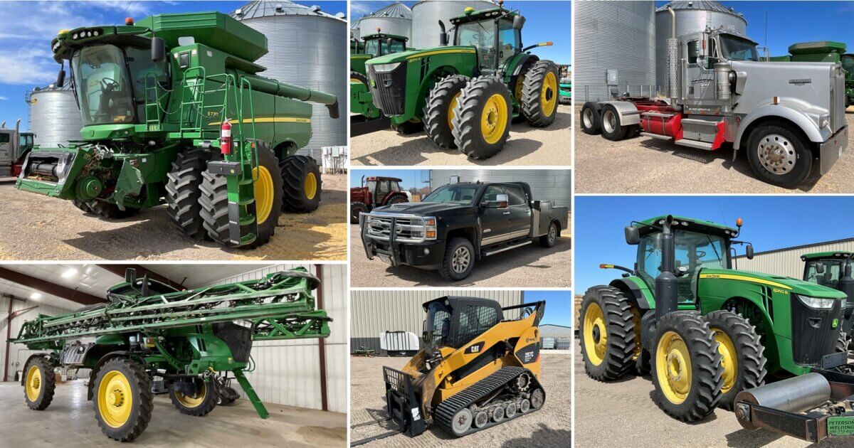John Deere 5770 Combine • John Deere 8370 R Tractor • John Deere 1775 24 Row Planter • John Deere R4044 Sprayer • CAT 287C Skid Steer • 1999 Kenworth Truck • Mitsubishi RAKA Forklift • 2018 Timpte Super Hopper Trailer